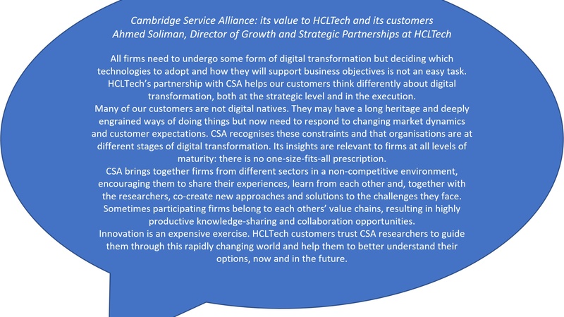 Share your challenges and approaches with non-competing organisations through our Community of Interest programme and join us at Cambridge Service Week, our annual flagship event that brings together industrialists, academics and policymakers to consider the latest thinking around services and digital technologies.