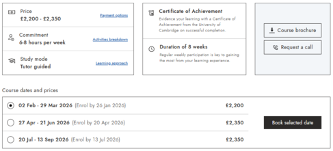 Our certificated courses reflect the Cambridge experience and values, with low student to tutor ratios and academically rigorous standards. Our learning model is designed to help you advance your skills and specialise in emerging areas that address global challenges. We will help you build your network through an engaging and impactful learning journey that encourages collaboration. Courses are delivered in weekly modules, allowing you to plan your time effectively. The assessment criteria will be presented to you at the start of the course, so you can approach your studies with confidence and motivation, knowing what is expected of you and how to meet those expectations.